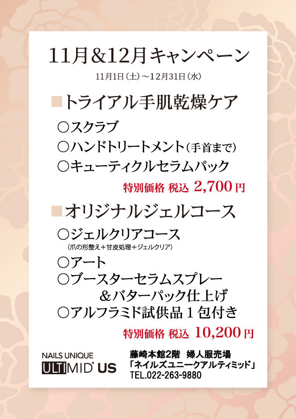 Campaign ネイルズユニークの期間限定キャンペーン 仙台藤崎 11月・12月キャンペーン 2025.11.01 Sat 12.31 Wed 仙台藤崎店の11月・12月キャンペーンは ◇トライアル手肌乾燥ケア 2,700円 ・スクラブ ・ハンドトリートメント(手首まで) ・キューティクルセラムパック ◆オリジナルジェルコース 10,200円 ・ジェルクリアコース(爪の形整え+甘皮処理+ジェルクリア) ・アート ・ブースターセラムスプレー&バターパック仕上げ ・アルフラミド試供品 1包 ぜひこの機会にお試し下さい。 開催店舗はこちら 全店共通イベント・キャンペーン一覧へ