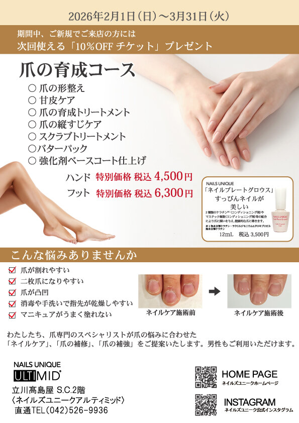 Campaign ネイルズユニークの期間限定キャンペーン 立川高島屋 2月・3月キャンペーン 2026.02.01 Sun 03.31 Tue 立川髙島屋店、2月・3月の期間中ご新規でご来店の方には次回使える「10%OFFチケット」プレゼント!≪爪の育成コース≫・爪の形整え ・甘皮ケ・爪の育成トリートメント ・爪の縦すじケア・スクラブトリートメント ・バターパック・強化剤ベースコートハンド 特別価格 税込 4,500円 / フット 特別価格 税込 6,300円また、爪のお悩み別アイテムも取り揃えております。みなさまのご来店を心よりお待ち致しております。 開催店舗はこちら 全店共通イベント・キャンペーン一覧へ