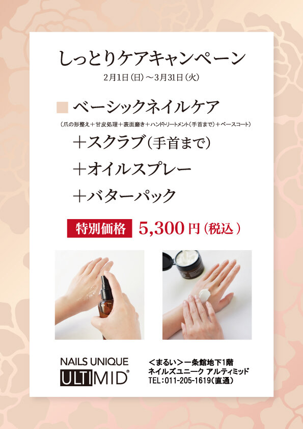 Campaign ネイルズユニークの期間限定キャンペーン 丸井今井札幌 2月・3月キャンペーン 2026.02.01 Sun 03.31 Tue 丸井今井札幌店では2月・3月の期間中しっとりケアキャンペーンを行います。◇ベーシックネイルケア 特別価格 5,300円(爪の形整え+甘皮処理+表面磨き+ハンドトリートメント(手首まで)+ベースコート)+スクラブ(手首まで)+オイルスプレー+バターパックぜひ、この機会にお試し下さい。 開催店舗はこちら 全店共通イベント・キャンペーン一覧へ