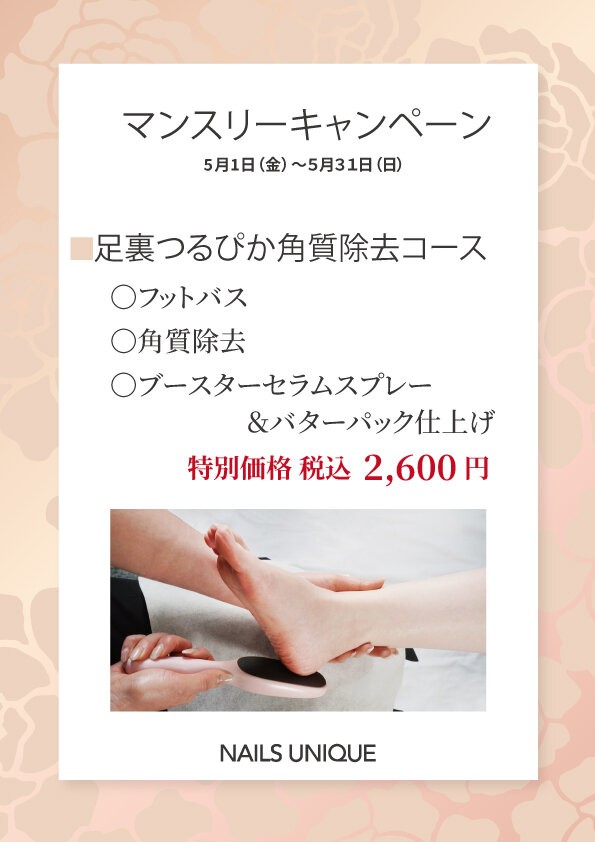 Campaign ネイルズユニークの期間限定キャンペーン そごう大宮 5月キャンペーン 2026.05.01 Fri 05.31 Sun そごう大宮店では、5月1日(金)から5月31日(日)までの期間中 「足裏つるぴか角質除去コース」を特別価格でお試しいただけます。 ◇足裏つるぴか角質除去コース 特別価格 税込 2,600円 ・フットバス ・角質除去 ・ブースターセラムスプレー&バターパック仕上げ かかとつるぴかで、サンダルの季節の準備をしませんか? 開催店舗はこちら 全店共通イベント・キャンペーン一覧へ