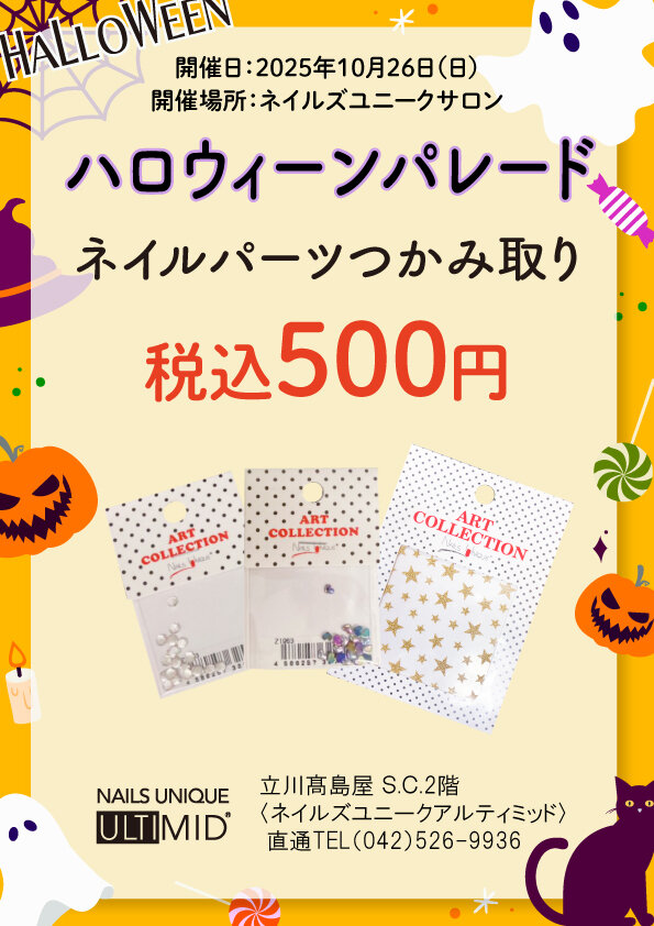 Campaign ネイルズユニークの期間限定キャンペーン 立川髙島屋 ハロウィンパレード 2025.10.26 Sun 10.26 Sun 立川髙島屋店では、10月26日(日)限定で 「ハロウィンパレード ネイルパーツつかみ取り 500円」で開催致します。 もうすぐハロウィン!ネイルパーツをのせて ハロウィンネイルをたのしんで。 開催店舗はこちら 全店共通イベント・キャンペーン一覧へ