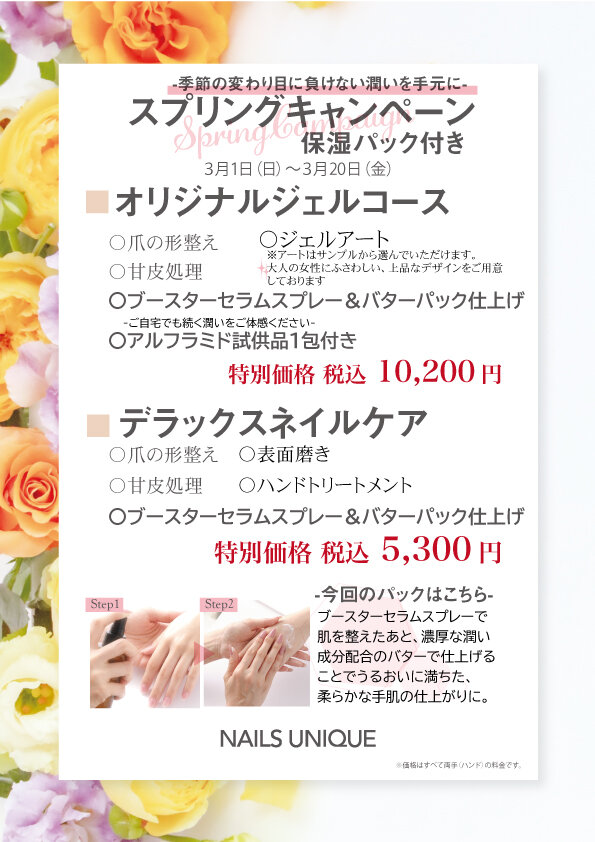 Campaign ネイルズユニークの期間限定キャンペーン 富山大和 スプリングキャンペーン 2026.03.01 Sun 02.20 Fri 富山大和店では、3月20日(金)までの期間中スプリングキャンペーン(保湿パック付き)を行います。◇オリジナルジェルコース 特別価格 税込 10,200円・爪の形整え ・ジェルアート・甘皮処理 ・ブースターセラムスプレー&バターパック仕上げ・アルフラミド試供品1包み◆デラックスネイルケア 特別価格 税込 5,300円・爪の形整え ・表面磨き・甘皮処理 ・ハンドトリートメント・ブースターセラムスプレー&バターパック仕上げぜひ、この機会にお試し下さい。 開催店舗はこちら 全店共通イベント・キャンペーン一覧へ