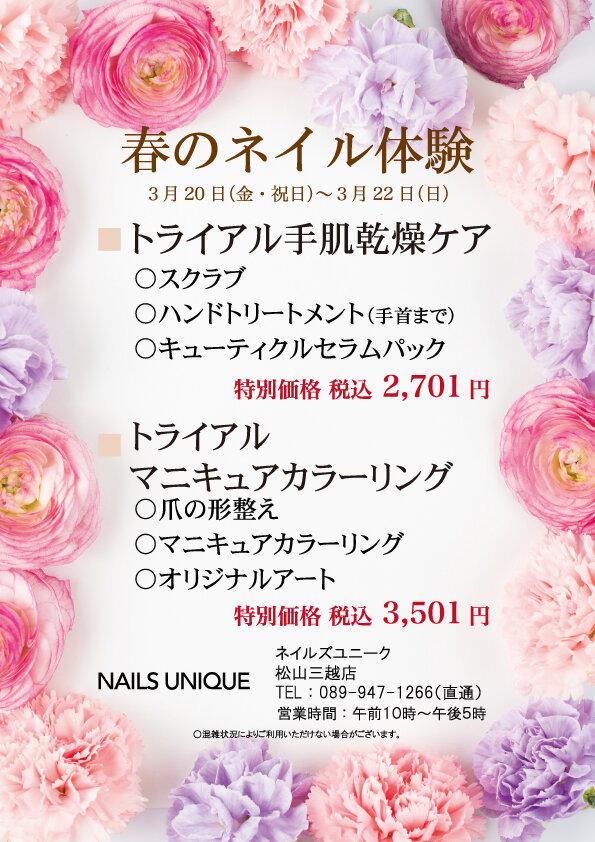Campaign ネイルズユニークの期間限定キャンペーン 松山三越 春のネイル体験 2026.03.20 Fri 03.22 Sun 松山三越店では、3月20日(金・祝日)から3月22日(日)の3日間限定で「春のネイル体験」を実施中です。◇トライアル手肌乾燥ケア 特別価格 税込 2,700円・スクラブ ・ハンドトリートメント(手首まで)・キューティクルセラムパック◆トライアル マニキュアカラーリング 特別価格 税込 3,500円・爪の形整え ・マニキュアカラーリング・オリジナルアートぜひこの機会に、お試し下さい。 開催店舗はこちら 全店共通イベント・キャンペーン一覧へ