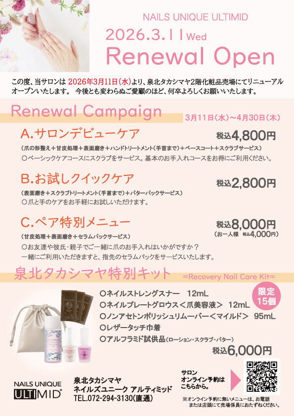 Campaign ネイルズユニークの期間限定キャンペーン 泉北タカシマヤ リニューアルキャンペーン 2026.03.11 Wed 04.30 Thu 2026年3月11日(水)より、2階化粧品売り場にてリニューアルオープンいたしました。 リニューアルキャンペーンを開催中! 簡単なお手入れから、しっかりお手入れまで、ぜひこの機会にお立ち寄りください。 店舗限定キットも同時販売中☆ 開催店舗はこちら 全店共通イベント・キャンペーン一覧へ