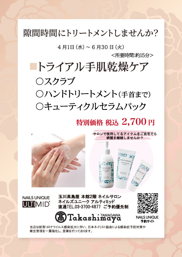 Campaign ネイルズユニークの期間限定キャンペーン 玉川高島屋 「隙間時間にトリートメントしませんか?」 2026.04.01 Wed 06.30 Tue 玉川高島屋店では4月1日(水)から6月30日(火)の期間中隙間時間でも出来る特別メニューキャンペーンを行います。◇トライアル手肌乾燥ケア<所要時間:約15分> 特別価格 税込 2,700円・スクラブ ・ハンドトリートメント(手首まで)・キューティクルセラムパックその他、爪のお悩み別メニューも多数ご用意しております。ぜひ、この機会にお気軽にお越しください。スタッフ一同、皆様のお越しを心よりお待ち致しております。 開催店舗はこちら 全店共通イベント・キャンペーン一覧へ
