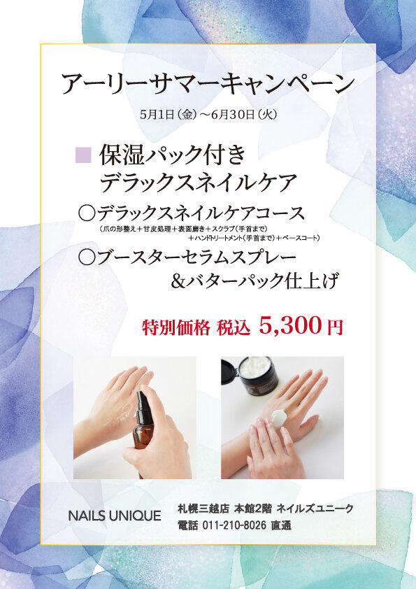 Campaign ネイルズユニークの期間限定キャンペーン 札幌三越 アーリーサマーキャンペーン 2026.05.01 Fri 06.30 Tue 札幌三越店では、5月1日(金)から6月30日(火)の期間中「アーリーサマーキャンペーン」を行います。◇保湿パック付き デラックスネイルケア ・デラックスネイルケアコース(爪の形整え+甘皮処理+表面磨き+スクラブ(手首まで)+ハンドトリートメント(手首まで)+ベースコート)・ブースターセラムスプレー&バターパック仕上げ特別価格 税込 5,300円夏はもうそこまで!ぜひ、この機会にお試し下さい。 開催店舗はこちら 全店共通イベント・キャンペーン一覧へ