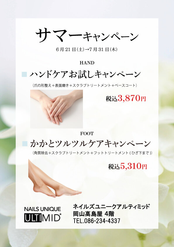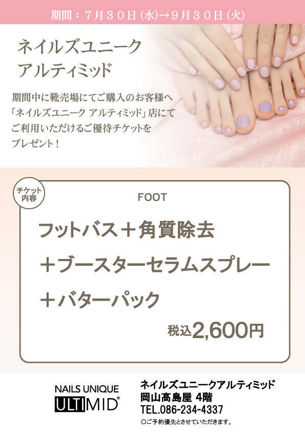 Salon Details 店舗詳細 岡山高島屋店 中国・四国・九州エリア 住所 岡山県岡山市北区本町6-40 岡山高島屋4階 TEL 086-234-4337 営業時間 10:00~19:00 各テーブル台数 ハンド4席/フット2席 サロンより一言 婦人服フロアにある当サロンでは、落ち着いた雰囲気の中でゆっくりとお過ごしいただけます。 お手入れ、アートなどオールマイティに対応できるスタッフのみ在籍しております。 ネイルサロンが初めてのお客様もお気軽にお立ち寄りくださいませ。 キャンペーン 岡山髙島屋 8月・9月キャンペーン 2025.07.30 Wed 2025.09.30 Tue 岡山髙島屋 7月キャンペーン 2025.06.21 Sat 2024.07.31 Wed 岡山高島屋 4月・5月キャンペーン 2025.04.01 Tue 2025.05.31 Sat 岡山高島屋 4月・5月キャンペーン 2025.03.28 Fri 2025.04.30 Wed アクセスマップ キャンペーン一覧を見る 近くのネイルサロンを探す