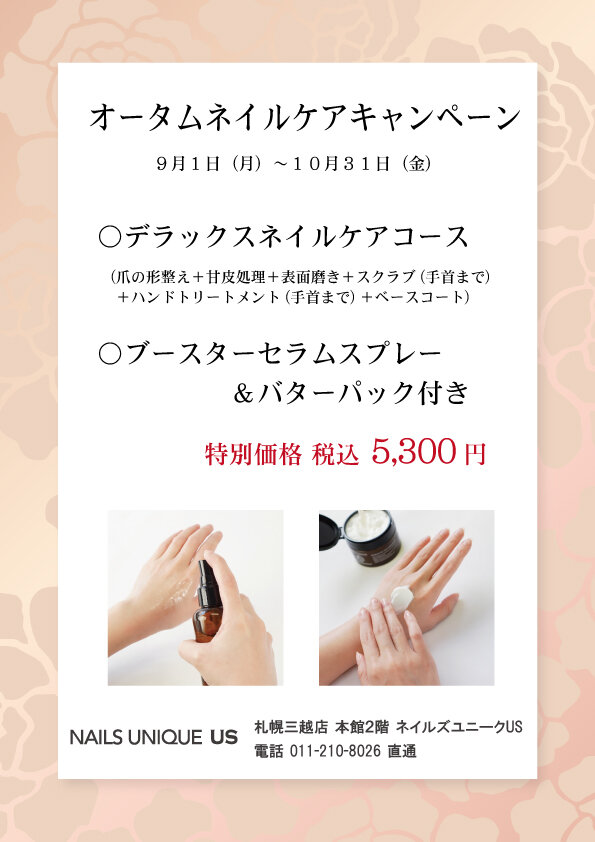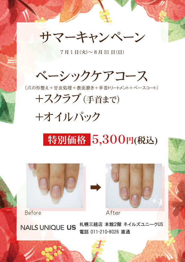 Salon Details 店舗詳細 札幌三越店 北海道・東北エリア 住所 北海道札幌市中央区南1条西3丁目8 札幌三越 本館2F TEL 011-210-8026 営業時間 10:00~19:00 各テーブル台数 ハンド4席/フット2席 サロンより一言 ネイルケアやジェルネイルはもちろんネイルズユニークオリジナルの速乾性ポリッシュや保湿アイテムも取り揃えております。落ち着いた空間でネイルサービスをお楽しみ頂けますので、初めての方もお気軽にご来店くださいませ。 キャンペーン 札幌三越 11月・12月キャンペーン 2025.11.01 Sat 2025.12.31 Wed 札幌三越 9月・10月キャンペーン 2025.09.01 Mon 2025.10.31 Fri 札幌三越 7月・8月キャンペーン 2025.07.01 Tue 2024.08.31 Sat 札幌三越 5月・6月キャンペーン 2025.05.01 Thu 2024.06.30 Sun アクセスマップ キャンペーン一覧を見る 近くのネイルサロンを探す