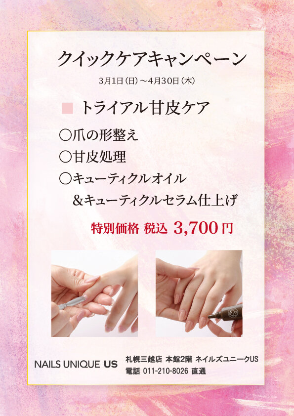 Salon Details 店舗詳細 札幌三越店 北海道・東北エリア 住所 北海道札幌市中央区南1条西3丁目8 札幌三越 本館2F TEL 011-210-8026 営業時間 10:00~19:00 各テーブル台数 ハンド4席/フット2席 サロンより一言 ネイルケアやジェルネイルはもちろんネイルズユニークオリジナルの速乾性ポリッシュや保湿アイテムも取り揃えております。落ち着いた空間でネイルサービスをお楽しみ頂けますので、初めての方もお気軽にご来店くださいませ。 キャンペーン 札幌三越 3月・4月キャンペーン 2026.03.01 Sun 2026.04.30 Thu 札幌三越 1月・2月キャンペーン 2026.01.02 Fri 2026.02.28 Sat 札幌三越 11月・12月キャンペーン 2025.11.01 Sat 2025.12.31 Wed 札幌三越 5月・6月キャンペーン 2025.05.01 Thu 2024.06.30 Sun アクセスマップ キャンペーン一覧を見る 近くのネイルサロンを探す