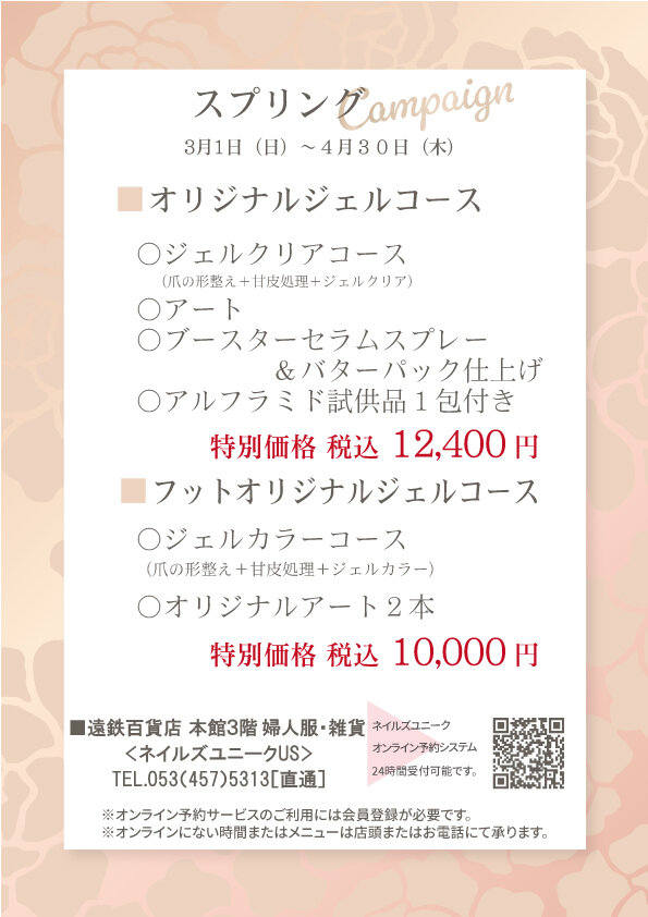 Salon Details 店舗詳細 浜松遠鉄店 東海・北陸エリア 住所 静岡県浜松市中央区砂山町320-2 遠鉄百貨店本館3階 TEL 053-457-5313 営業時間 10:00〜19:00 各テーブル台数 ハンド4席/フット2席 サロンより一言 親切、丁寧な接客を心掛けております。 はじめての方や男性の方などにオススメなお手入れのコースもございますのでお気軽にお立ち寄りください。 キャンペーン 浜松遠鉄 3月・4月キャンペーン 2026.03.01 Sun 2026.04.30 Thu 浜松遠鉄 7月・8月キャンペーン 2025.07.01 Tue 2025.08.18 Mon 浜松遠鉄 7月・8月キャンペーン 2025.07.01 Tue 2025.08.31 Sun 浜松遠鉄 5月・6月キャンペーン 2025.05.01 Thu 2024.06.30 Sun アクセスマップ キャンペーン一覧を見る 近くのネイルサロンを探す