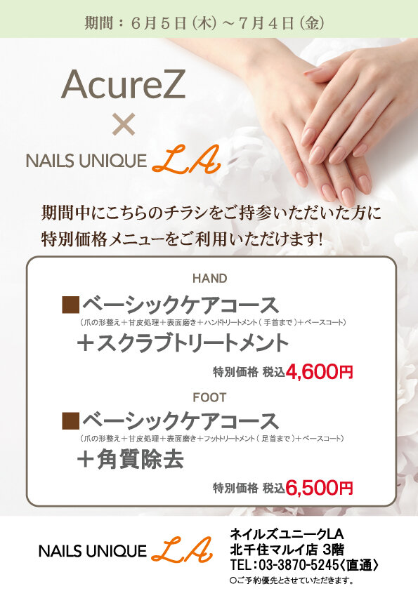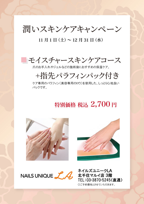 Salon Details 店舗詳細 北千住丸井店 関東エリア 住所 東京都足立区千住3-92 北千住マルイ3階 TEL 03-3870-5245 営業時間 10:00~20:00 各テーブル台数 ハンド5席/フット2席 サロンより一言 広々として、明るい清潔感のあるサロンです。 フットルームも広く、ゆったりとした気持ちで癒しの時間を過ごしていただけます。 スタッフ全員マスク着用、消毒を行なっており、 各テーブルにパーテーションを立てて新型ウイルス対策もしております。 キャンペーン 北千住丸井 11月・12月キャンペーン 2025.11.01 Sat 2025.12.31 Wed 北千住丸井 7月キャンペーン 2025.06.05 Thu 2025.07.04 Fri 北千住丸井 3月・4月キャンペーン 2025.03.11 Tue 2025.04.20 Sun 北千住丸井 2月・3月キャンペーン 2025.02.08 Sat 2025.03.07 Fri アクセスマップ キャンペーン一覧を見る 近くのネイルサロンを探す