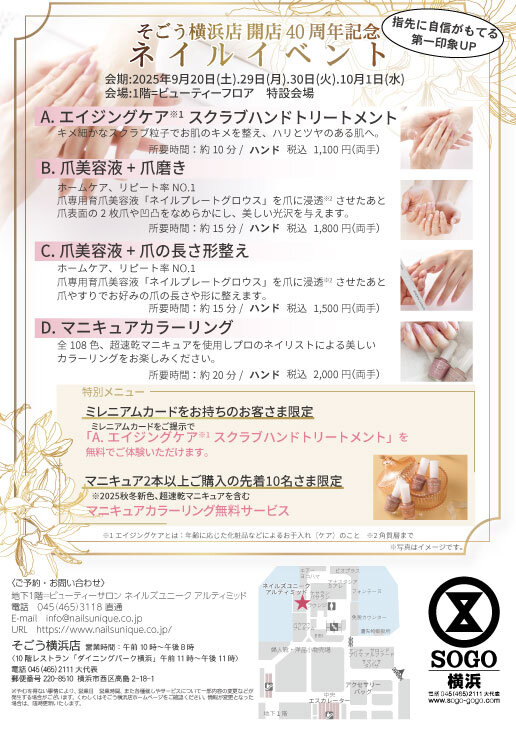 Salon Details 店舗詳細 そごう横浜店 関東エリア 住所 神奈川県横浜市西区高島2-18-1 そごう横浜店B1階 TEL 045-465-3118 営業時間 10:00~20:00 各テーブル台数 ハンド4席/フット2席/プレミアムルーム2席(メンズ利用可能席) サロンより一言 ネイルケアやネイルアートが初めての方が安心してご来店頂けるよう、お爪の悩みに合わせて施術前に丁寧なカウンセリングをいたします。 ゆったりと落ち着いて施術を受けていただける半個室のプライベートルームは、ご夫婦やお連れ様同士でご利用の際にくつろぎの空間が好評です。 ご利用の際はご予約時、お申し付けくださいませ。 また、ネイルズユニーク専売の速乾性マニキュアやプロ仕様のジェルネイルなど、セルフネイルに必要なネイル用品お買い求めいただけます。 お気軽にお立ち寄りください。 スタッフ一同、心よりご来店お待ちしております。 安心・安全の技術の日本ネイリスト協会「認定ネイルサロン」 ・JNA1級ネイリスト ・ジェルネイル検定上級ネイリスト 在籍 「ネイルサロン衛生管理自主基準」におけるネイルサロン衛生管理士 在籍 キャンペーン そごう横浜 40周年記念イベント 2025.09.20 Sat 2025.10.01 Wed 横浜そごう ネイルズユニーク X ポメラート 2024.08.01 Thu 2024.08.31 Sat アクセスマップ キャンペーン一覧を見る 近くのネイルサロンを探す