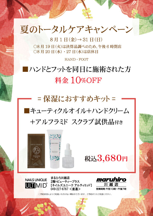 Salon Details 店舗詳細 丸広川越店 関東エリア 住所 埼玉県川越市新富町2-6-1 丸広百貨店 川越店2階 TEL 049-227-6767 営業時間 10:00~19:00 各テーブル台数 ハンド3席/フット2席 サロンより一言 お爪の形整え、甘皮処理の単品メニューから、 華やかなジェルアートまで、幅広いメニューがございます。 初めてのお客様にも安心して頂けるようしっかりとしたカウンセリングを心がけております。 皆様のご来店をスタッフ一同心よりお待ちしております。 キャンペーン 丸広川越 10月キャンペーン 2025.10.01 Wed 2025.10.31 Fri 丸広川越 8月キャンペーン 2025.08.01 Fri 2025.08.31 Sun 丸広川越店 6月・7月キャンペーン 2025.06.01 Sun 2025.07.31 Thu 丸広川越 5月キャンペーン 2025.05.05 Mon 2025.05.31 Sat アクセスマップ キャンペーン一覧を見る 近くのネイルサロンを探す