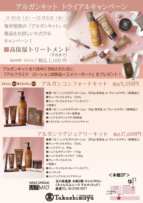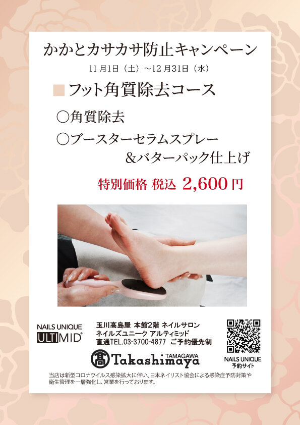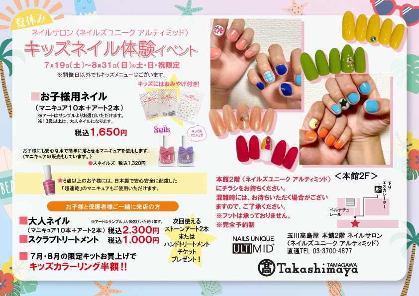 Salon Details 店舗詳細 玉川高島屋 関東エリア 住所 東京都世田谷区玉川3丁目17-1 玉川髙島屋本館2階 TEL 03-3700-4877 営業時間 10:00~20:00 各テーブル台数 ハンド4席/フット1席 サロンより一言 白を基調とした、コンパクトで明るい雰囲気のサロンです。 スタッフ一同、笑顔でお待ち致しております。 大人気のジェルネイルだけでなく、基本のケアコースもあり、ホームケア用品も豊富に取り揃えております。 初めての方も、お気軽にお立ち寄りくださいませ。 キャンペーン 玉川髙島屋 11月・12月キャンペーン 2025.11.01 Sat 2025.12.31 Wed 玉川髙島屋 11月・12月キャンペーン 2025.11.01 Sat 2025.12.31 Wed 玉川髙島屋 キッズネイル体験イベント 2025.07.19 Sat 2025.08.31 Sun 玉川高島屋店 6月・7月キャンペーン 2025.06.01 Sun 2025.07.31 Thu アクセスマップ キャンペーン一覧を見る 近くのネイルサロンを探す