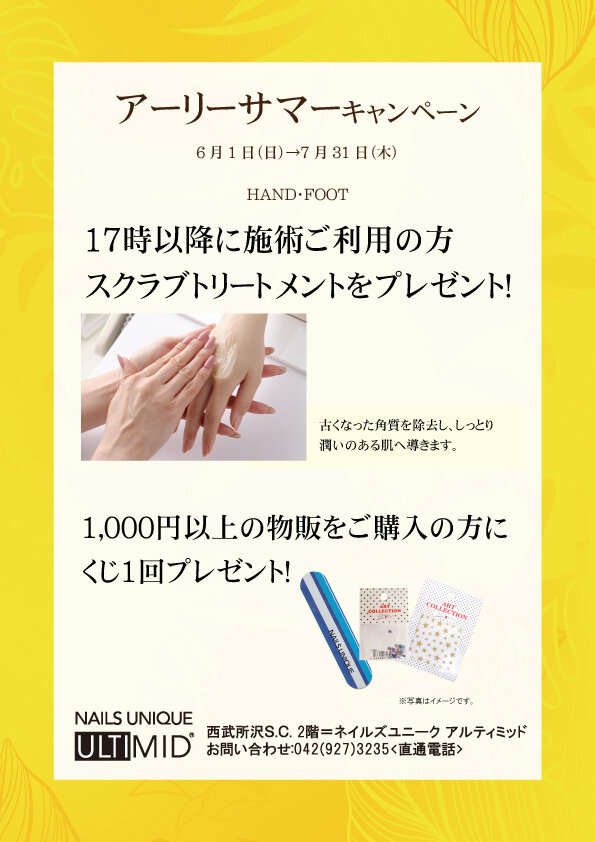 Salon Details 店舗詳細 所沢西武店 関東エリア 住所 埼玉県所沢市日吉町12-1 所沢西武百貨店2F 化粧品売場 TEL 04-2927-3235 営業時間 10:00~20:00 各テーブル台数 ハンド4席/フット2席 サロンより一言 エントランスよりも奥にあり、広々とした空間でゆったり落ち着いて施術を受けられます。 ネイルサロンが初めての方でも安心してご利用して頂けるよう、 安心で丁寧なカウンセリングを心掛けております。 カラーリングの他に、ケアのコースや単品メニューなど数多くございます。 スタッフ一同心よりお待ちしております。 キャンペーン 所沢西武 6月・7月かキャンペーン 2025.06.01 Sun 2024.07.31 Wed 所沢西武店 アーリーサマーキャンペーン 2025.06.01 Sun 2025.07.31 Thu 所沢西武 スプリングキャンペーン 2025.04.01 Tue 2024.05.31 Fri 所沢西武 4月・5月キャンペーン 2025.04.01 Tue 2025.04.25 Fri アクセスマップ キャンペーン一覧を見る 近くのネイルサロンを探す