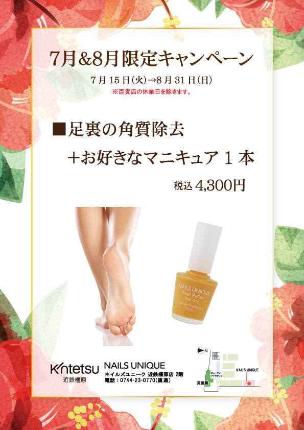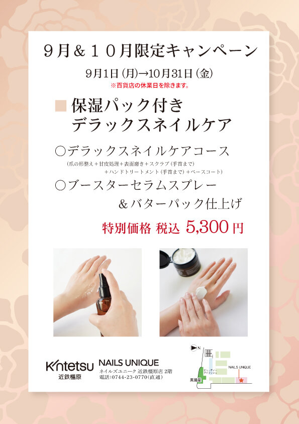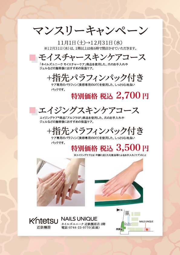 Salon Details 店舗詳細 橿原近鉄店 近畿エリア 住所 奈良県橿原市北八木町3-65-11 橿原近鉄2階 TEL 0744-23-0770 営業時間 10:00〜19:00 各テーブル台数 ハンド4席/フット2席 サロンより一言 基本のケアからジェルネイルまでコースメニューの他に爪の形整えや表面磨きなどの単品メニューもございます。 お手元、お足元の爪のお悩みや、デザインのご相談など初めての方もお気軽にお立ち寄り下さいませ。 スタッフ一同、心よりお待ちしております。 キャンペーン 橿原近鉄 11月・12月キャンペーン 2025.11.01 Sat 2025.12.31 Wed 橿原近鉄 9月・10月キャンペーン 2025.09.01 Mon 2025.10.31 Fri 橿原近鉄 7月・8月キャンペーン 2025.07.15 Tue 2024.08.31 Sat 橿原近鉄 Thanksキャンペーン 2025.05.01 Thu 2024.05.10 Fri アクセスマップ キャンペーン一覧を見る 近くのネイルサロンを探す