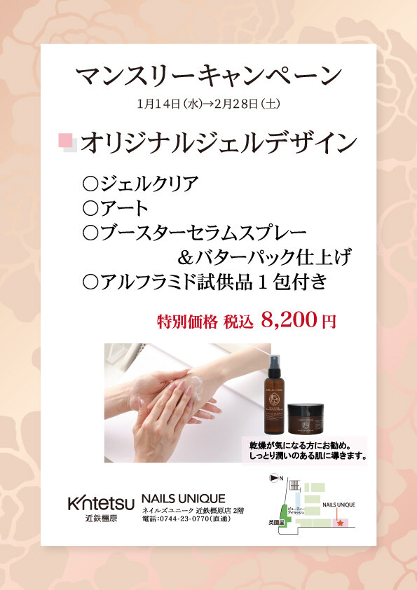 Salon Details 店舗詳細 橿原近鉄店 近畿エリア 住所 奈良県橿原市北八木町3-65-11 橿原近鉄2階 TEL 0744-23-0770 営業時間 10:00〜19:00 各テーブル台数 ハンド4席/フット2席 サロンより一言 基本のケアからジェルネイルまでコースメニューの他に爪の形整えや表面磨きなどの単品メニューもございます。 お手元、お足元の爪のお悩みや、デザインのご相談など初めての方もお気軽にお立ち寄り下さいませ。 スタッフ一同、心よりお待ちしております。 キャンペーン 橿原近鉄 3月・4月キャンペーン 2026.03.01 Sun 2026.04.30 Thu 橿原近鉄 1月・2月キャンペーン 2026.01.14 Wed 2026.02.28 Sat 橿原近鉄 11月・12月キャンペーン 2025.11.01 Sat 2025.12.31 Wed 橿原近鉄 9月・10月キャンペーン 2025.09.01 Mon 2025.10.31 Fri アクセスマップ キャンペーン一覧を見る 近くのネイルサロンを探す