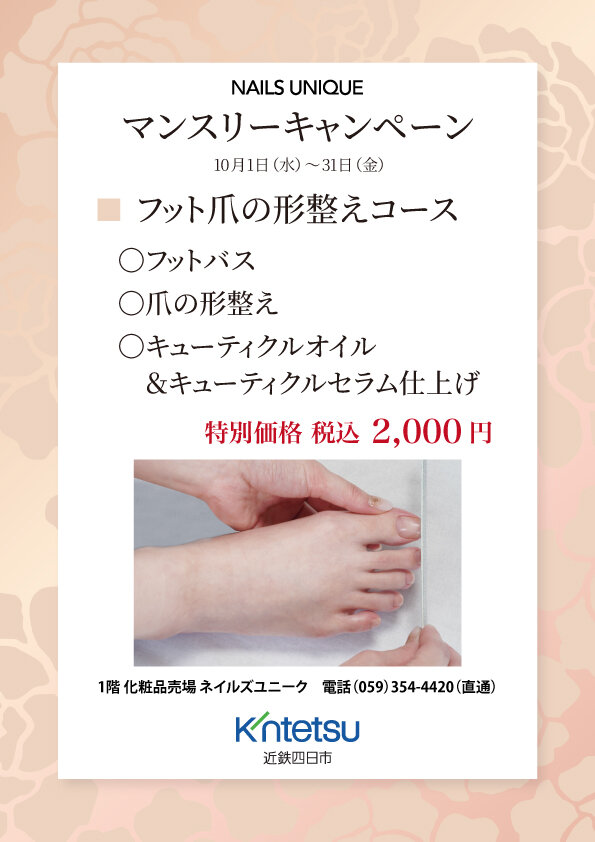 Salon Details 店舗詳細 四日市近鉄店 近畿エリア 住所 三重県四日市市諏訪栄町7-34 近鉄四日市店1階 TEL 059-354-4420 営業時間 10:00~18:30 各テーブル台数 ハンド3席/フット2席 サロンより一言 お客様に最高のおもてなしが出来るよう、明るく元気にお出迎えいたします! お気軽にお立ち寄りください。 心よりお待ちいたしております。 誠に勝手ながら諸般の事情により、 毎週水曜日・木曜日は臨時休業となります。 大変ご迷惑をお掛けいたしますが ご理解賜りますようよろしくお願い申し上げます。 キャンペーン 四日市近鉄 10月キャンペーン 2025.10.01 Wed 2025.10.31 Fri 四日市近鉄 4月キャンペーン 2025.04.04 Fri 2025.04.06 Sun アクセスマップ キャンペーン一覧を見る 近くのネイルサロンを探す