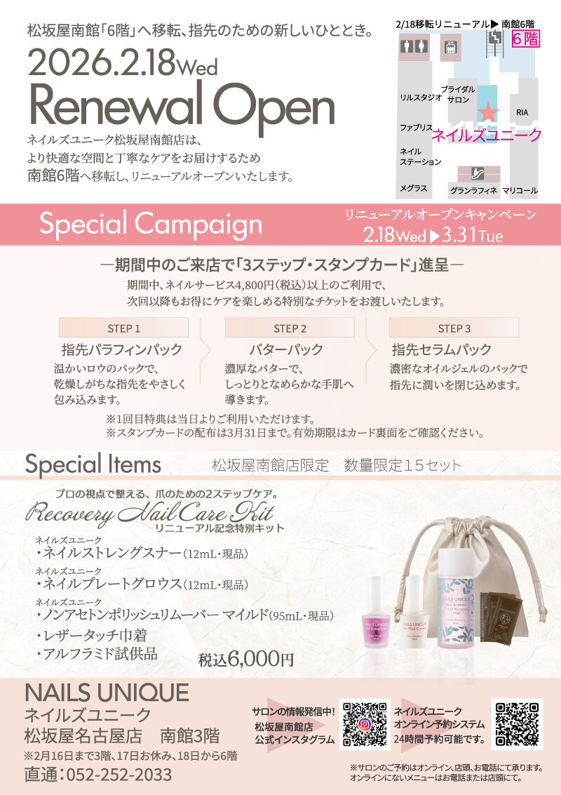 Salon Details 店舗詳細 松坂屋南館店 東海・北陸エリア 住所 愛知県名古屋市中区栄3-16-1 松坂屋南館6階 TEL 052-252-2033 営業時間 10:00~20:00 各テーブル台数 ハンド6席/フット3席 サロンより一言 ゆったりとした店内で、おくつろぎ頂けるお時間をご提供させていただきます。 ご要望、ご質問ございましたらお気軽におたずね下さい。 皆様のご来店を心よりお待ちしております。 キャンペーン 松坂屋南館 リニューアルキャンペーン 2026.02.18 Wed 2026.03.31 Tue 名古屋松坂屋 キャンペーン 2023.05.01 Mon 2024.06.30 Sun アクセスマップ キャンペーン一覧を見る 近くのネイルサロンを探す